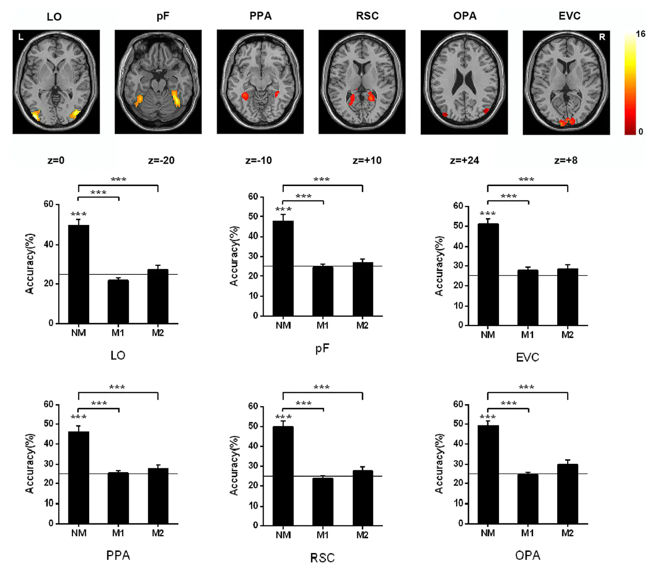 Significant objects in a scene can make a great contribution to scene recognition. Besides the three scene-selective regions: parahippocampal place area (PPA), retrosplenial complex (RSC), and occipital place area (OPA), some neuroimaging studies have shown that the lateral occipital complex (LOC) is also engaged in scene recognition processing. In this study, the multivariate pattern analysis was adopted to explore the object-scene association in scene recognition when different amounts of significant objects were masked. The scene classification only succeeded in the intact scene in the ROIs. In addition, the average signal intensity in LOC [including the lateral occipital cortex (LO) and the posterior fusiform area (pF)] decreased when there were masked objects, but such a decrease was not observed in scene-selective regions. These results suggested that LOC was sensitive to the loss of significant objects and mainly involved in scene recognition by the object-scene semantic association. The performance of the scene-selective areas may be mainly due to the fact that they responded to the change of the scene’s entire attribute, such as the spatial information, when they were employed in the scene recognition processing. These findings further enrich our knowledge of the significant objects’ influence on the activation pattern during the process of scene recognition.