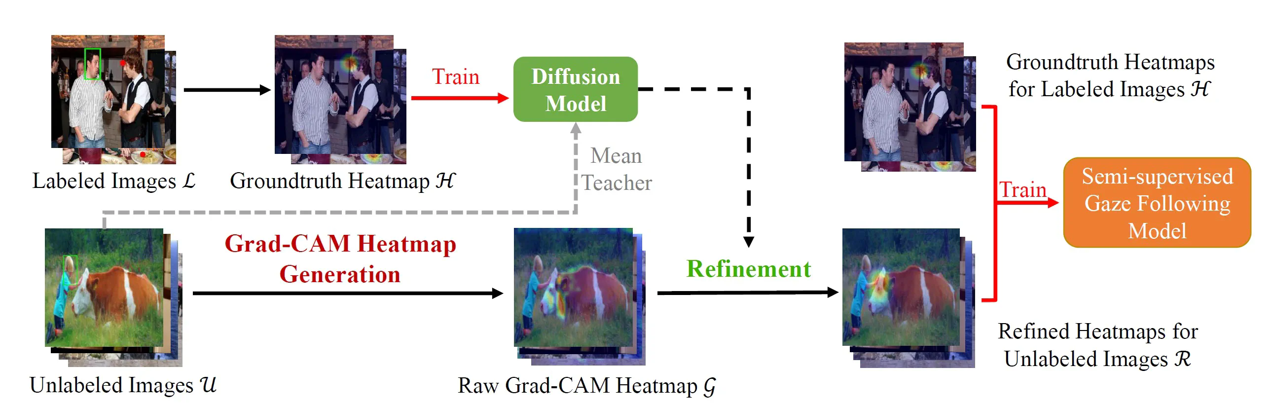 Training gaze following models requires a large number of images with gaze target coordinates annotated by human annotators, which is a laborious and inherently ambiguous process. We propose the first semi-supervised method for gaze following by introducing two novel priors to the task. We obtain the first prior using a large pretrained Visual Question Answering (VQA) model, where we compute Grad-CAM heatmaps by `prompting’ the VQA model with a gaze following question. These heatmaps can be noisy and not suited for use in training. The need to refine these noisy annotations leads us to incorporate a second prior. We utilize a diffusion model trained on limited human annotations and modify the reverse sampling process to refine the Grad-CAM heatmaps. By tuning the diffusion process we achieve a trade-off between the human annotation prior and the VQA heatmap prior, which retains the useful VQA prior information while exhibiting similar properties to the training data distribution. Our method outperforms simple pseudo-annotation generation baselines on the GazeFollow image dataset. More importantly, our pseudo-annotation strategy, applied to a widely used supervised gaze following model (VAT), reduces the annotation need by 50%.